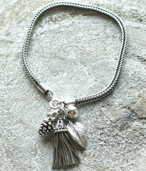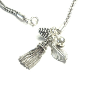 Het bandje is mooi sterk en stevig met een breedte van 2 mm. Aan het uiteinde hangt een trosje bedels die vol symboliek zitten. Het trosje bestaat uit een zilveren blaadje, twee balletjes, een dennenappeltje en een kwastje, bij elkaar een mooi rustig geheel.