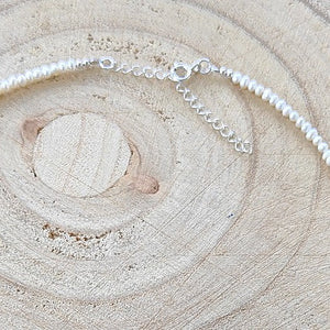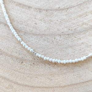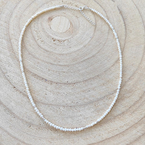 Deze mooie ketting is handgemaakt van kleine parelkraaltjes met zilveren kraaltjes er tussendoor.