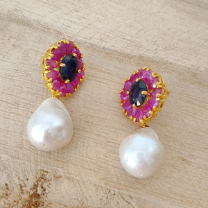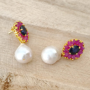 Oorbellen met robijn, saffier en barok parels goldplated.