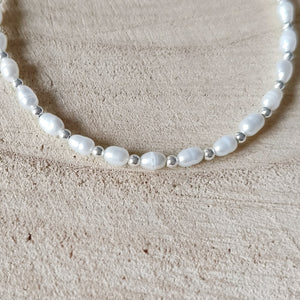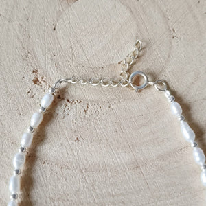 Het bijpassende armbandje is handgemaakt van kleine pareltjes met zilveren kraaltjes er tussendoor.